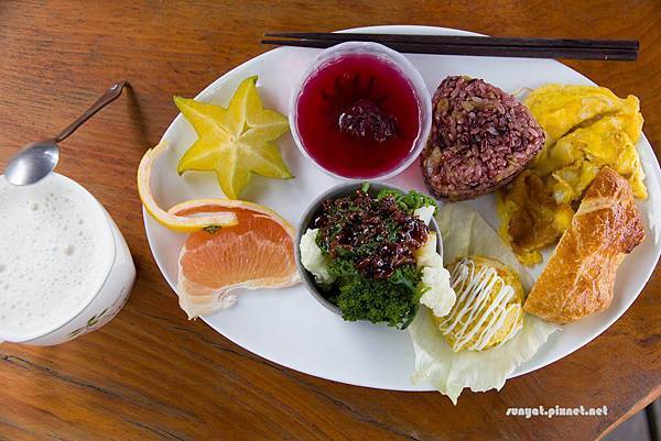 早餐一樣是豐富到爆炸的老闆娘愛心手作,豆漿超級濃,有紫米飯糰和麵包,蛋和沙拉,還有水果與洛神花果凍,