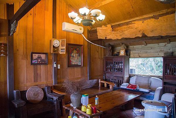 越牆工園在結構上就是以一間間的小木屋相區隔,客廳亦為木造桌椅為主體,有點台味的鄉村風擺設。