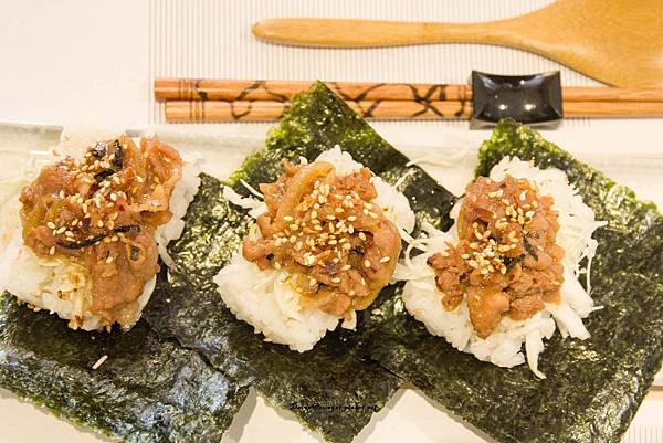薑汁燒肉給的大方,滿滿的快要溢出海苔外頭,米飯稍微黏黏粒粒,加上燒肉的醬汁甚是好吃。