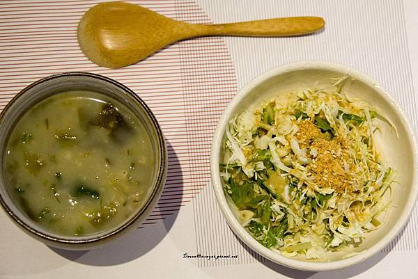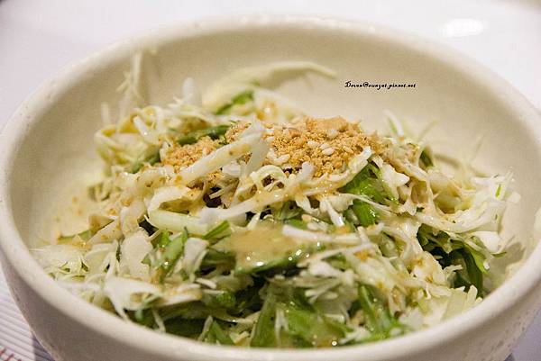 沙拉上頭的芝麻醬增添了切細蔬菜的滋味,因為放得多,口味稍重但我好喜歡。