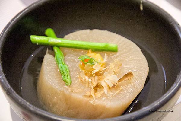 大根煮物十分入味,味噌醬料與柴魚並沒有搶走蘿蔔本身的甜美,加上蘆筍的擺飾讓人身感在日式氣氛中,
