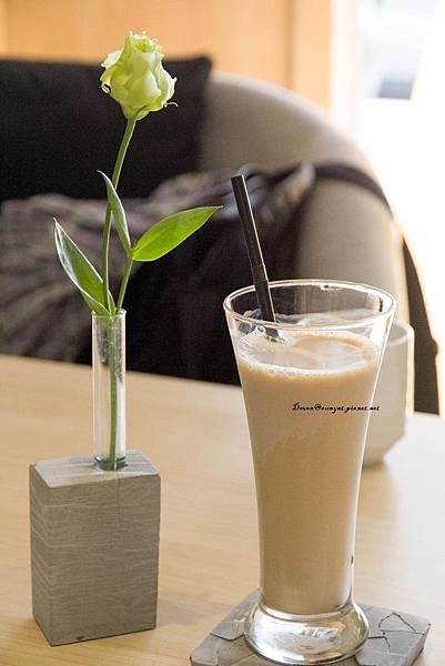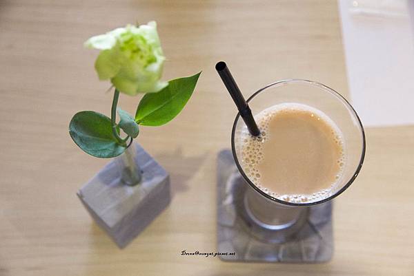 附上飲品鮮奶茶一杯,加上素淨的杯墊更顯質感,老闆將所有的精神投注在餐點上,