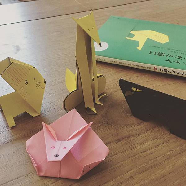 雖然小小一本就要1,500日幣,還是買了。 這幾天跟著書上面的示範晢了一些狐狸、山豬、獅子與小白兔的摺法,