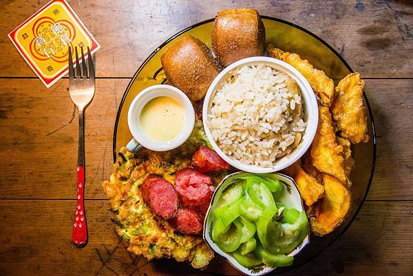 搭配旁邊的蔥蛋、台式香腸和炒絲瓜,讓人一口接著一口。旁邊還有地瓜薯條跟煉乳饅頭當作甜點,