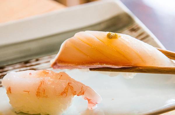 旁邊還有金桔可以淋在甜蝦身上,底下的醋飯沒有太「醋」或太冷,而是跟食材融合,