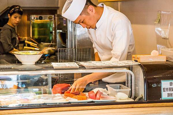 師傅正在做外帶的丼飯便當,看起來很讚捏,下次在家育兒我也要叫老公買丼飯給我吃。