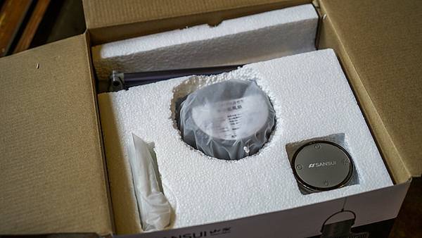 打開來,專屬的收納袋深灰色的很有質感,電風扇卡榫在保麗龍之間,