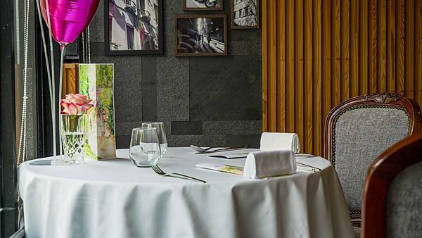 店內慶生氣球不斷,每桌桌上閃白的桌布與紅玫瑰的對比鮮明。