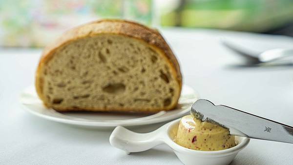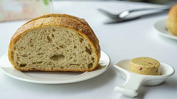 手工麵包熱騰騰酥脆上桌,將奶油些許融化些在上頭,