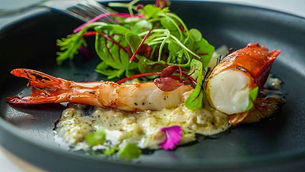 虎蝦與堅果煎烤、搭配白酒葡萄泥,帶有酒香發酵的滋味,