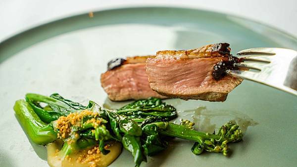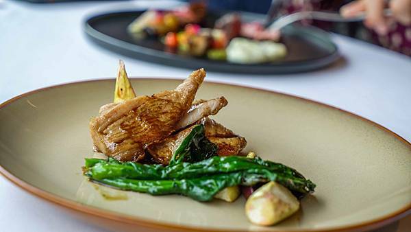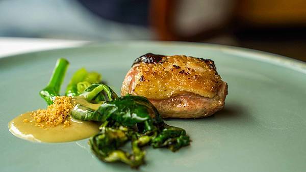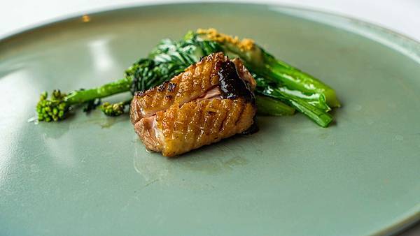 炭火直烤肉質帶有好香的鴨皮鴨油味道,芥藍花除醬汁還有撒上些許堅果粉,