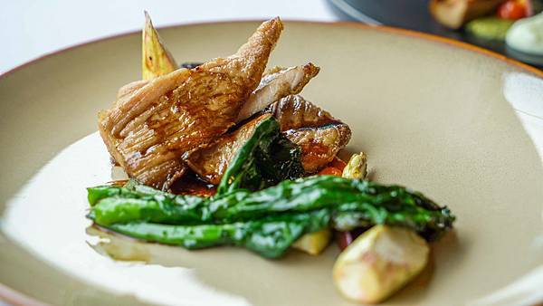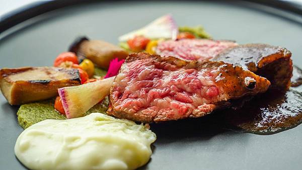 搭配松露紅酒醬與花椰菜泥,與烤過的時蔬,