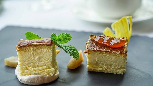 濃郁巴斯克下方踩著輕盈的草莓慕斯,上頭點綴著金棗,