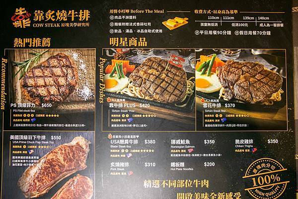 靠炙燒牛排菜單 ── 平日用餐限定90分鐘,假日用餐限定70分鐘,