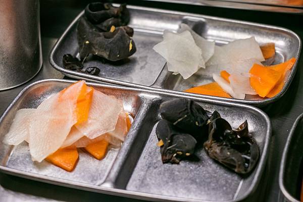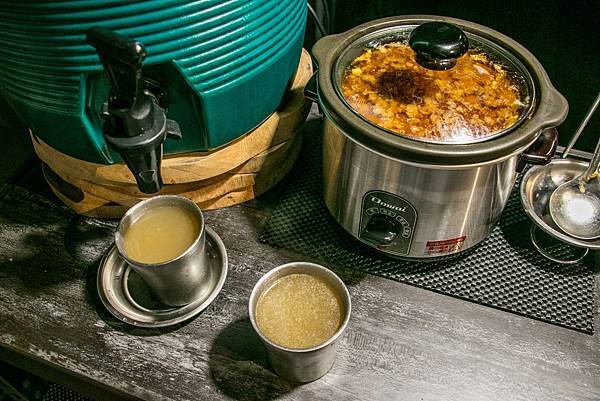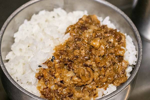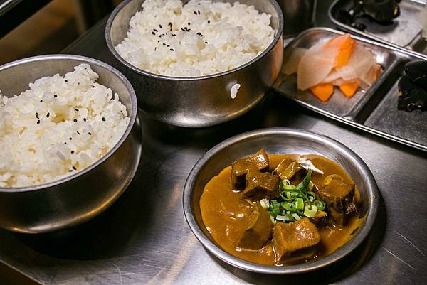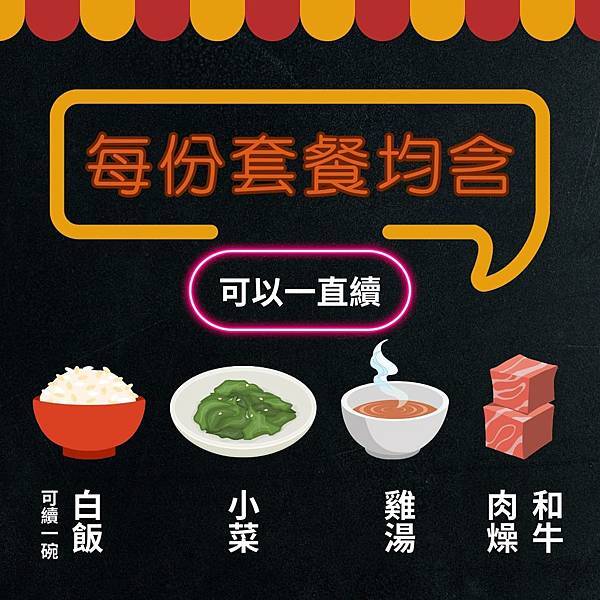 每份套餐包含白飯(很大碗可再續一次)、小菜(無限續),雞湯與和牛肉燥放自助吧檯。
